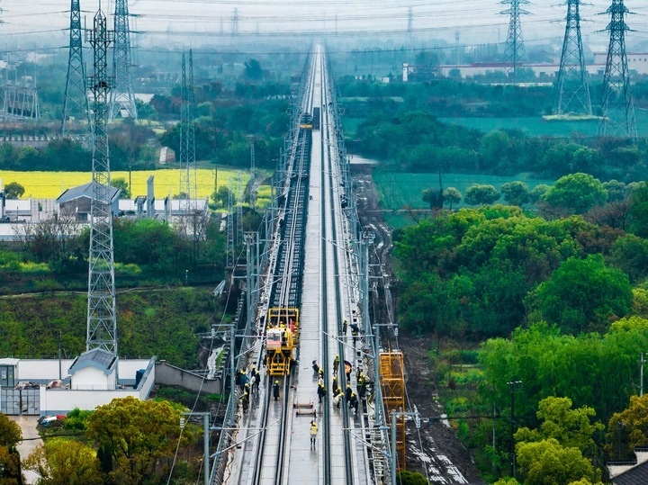 2024年4月7日,滬蘇湖鐵路鋪軌進入湖州吳興段。拍友 閔峰 攝