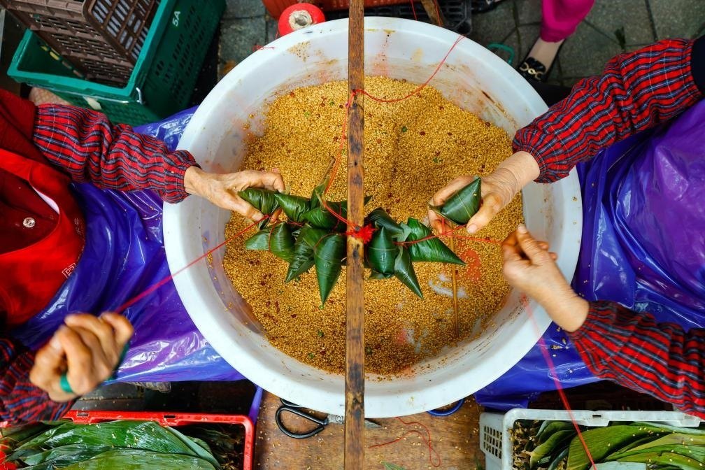 2006年5月31日,在山西省平遙縣街頭,一名外國游客在學(xué)習(xí)包粽子。