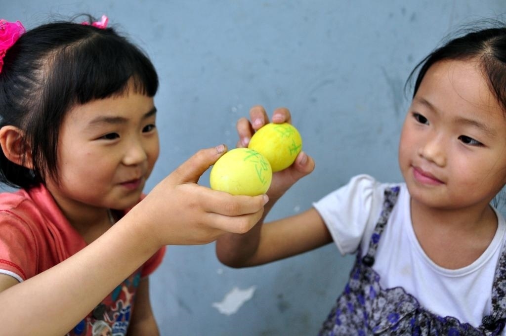 2010年6月13日,福建省莆田市城廂區(qū)第一實驗小學(xué)舉行端午節(jié)傳統(tǒng)習(xí)俗“撞虎蛋”體驗活動。學(xué)生們在經(jīng)五味草煮過的鴨蛋上寫下愿望,然后兩兩相撞,共祈今后更加平安、健康、聰明。這是兩位學(xué)生拿著寫有各自愿望的“虎蛋”相撞。