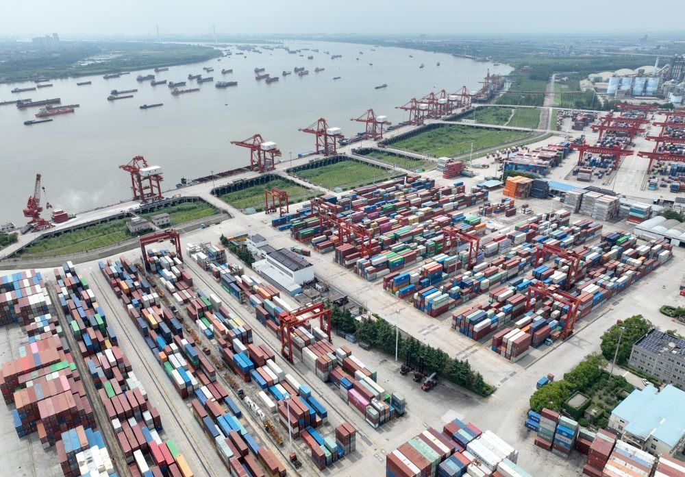 2024年6月1日拍攝的湖北武漢陽邏港(無人機(jī)照片)。2013年時(shí),陽邏港僅有兩條集裝箱航線,船型小、班期少;如今,陽邏港已開通各類集裝箱航線20余條,實(shí)現(xiàn)“航運(yùn)向東入海、班列向西入歐”。