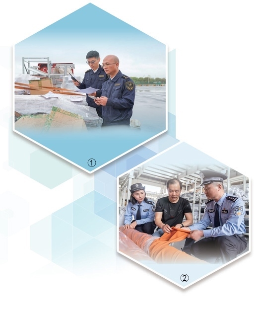圖①:上海海關(guān)所屬松江海關(guān)工作人員檢查貨物。上海海關(guān)致力打造通關(guān)手續(xù)更簡(jiǎn)便、通關(guān)效率更快捷、監(jiān)管更嚴(yán)密有效的營(yíng)商環(huán)境。姜輝輝攝(人民視覺) 圖②:江蘇南通通州區(qū)公安局西亭派出所民警走進(jìn)生產(chǎn)車間,了解企業(yè)情況,護(hù)航企業(yè)經(jīng)營(yíng)發(fā)展。翟慧勇攝(人民視覺)