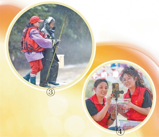 圖③:安徽省歙縣山越救援隊黨員(左)在轉移受災群眾。樊成柱攝(影像中國) 圖④:新疆維吾爾自治區(qū)烏蘇市黨員志愿者到田間地頭直播銷售草莓。李仁錫攝(影像中國)