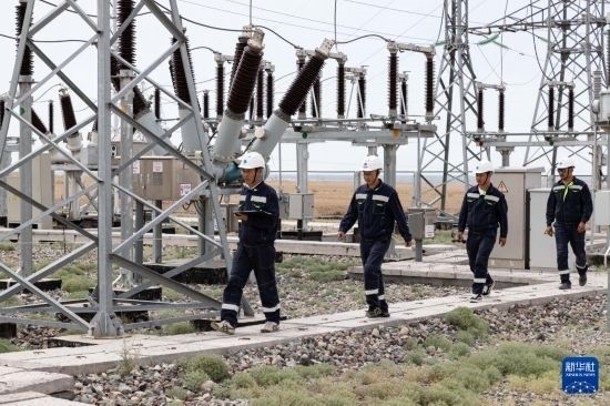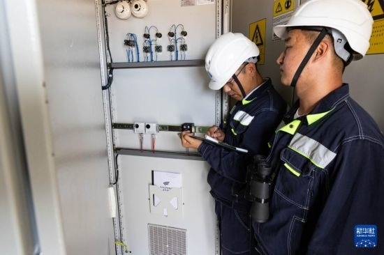 6月25日,在哈薩克斯坦阿拉木圖州謝列克風電場,中哈運行人員進行設(shè)備巡檢。白雪騏 攝