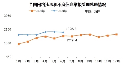 來自中央網(wǎng)信辦舉報中心的消息,2024年6月,中央網(wǎng)信辦舉報中心指導(dǎo)全國各級網(wǎng)信舉報工作部門、主要網(wǎng)站平臺受理網(wǎng)民舉報色情、賭博、侵權(quán)、謠言等違法和不良信息1992.3萬件,環(huán)比下降1.3%、同比增長12%。