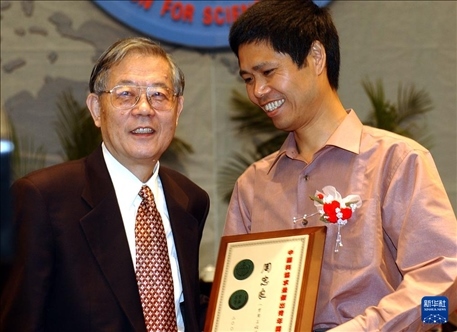 2003年9月13日,在中國科學(xué)技術(shù)協(xié)會(huì)2003年學(xué)術(shù)年會(huì)開幕式上,周光召同志為周忠良(右)等15人頒發(fā)中國科協(xié)“求是杰出青年獎(jiǎng)”。