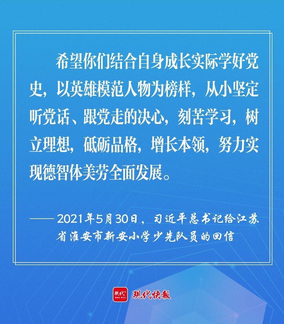 2021年5月30日,習(xí)近平總書(shū)記給江蘇省淮安市新安小學(xué)少先隊(duì)員回信時(shí)強(qiáng)調(diào),“希望你們結(jié)合自身成長(zhǎng)實(shí)際學(xué)好黨史,以英雄模范人物為榜樣,從小堅(jiān)定聽(tīng)黨話、跟黨走的決心,刻苦學(xué)習(xí),樹(shù)立理想,砥礪品格,增長(zhǎng)本領(lǐng),努力實(shí)現(xiàn)德智體美勞全面發(fā)展?!?/p>