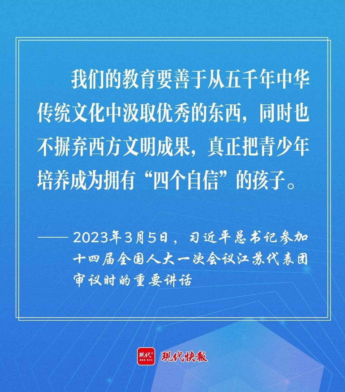 2023年3月5日,習(xí)近平總書(shū)記參加十四屆全國(guó)人大一次會(huì)議江蘇代表團(tuán)審議時(shí),勉勵(lì)教育工作者“要善于從五千年中華傳統(tǒng)文化中汲取優(yōu)秀的東西,同時(shí)也不摒棄西方文明成果,真正把青少年培養(yǎng)成為擁有‘四個(gè)自信’的孩子?!?/p>