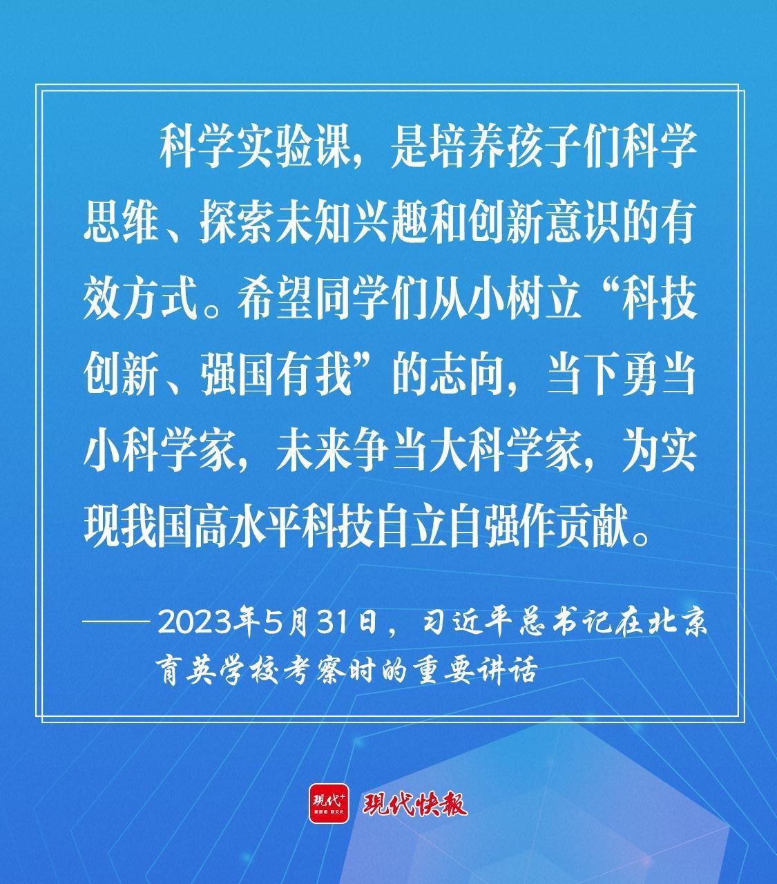 2023年5月,習(xí)近平總書(shū)記在北京育英學(xué)??疾鞎r(shí)強(qiáng)調(diào),希望同學(xué)們從小樹(shù)立“科技創(chuàng)新、強(qiáng)國(guó)有我”的志向,當(dāng)下勇當(dāng)小科學(xué)家,未來(lái)爭(zhēng)當(dāng)大科學(xué)家,為實(shí)現(xiàn)我國(guó)高水平科技自立自強(qiáng)作貢獻(xiàn)。