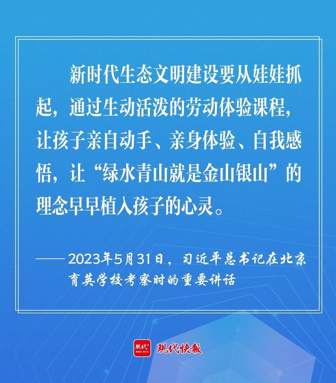 2023年5月,習(xí)近平總書(shū)記在北京育英學(xué)校考察時(shí)強(qiáng)調(diào),新時(shí)代生態(tài)文明建設(shè)要從娃娃抓起,通過(guò)生動(dòng)活潑的勞動(dòng)體驗(yàn)課程,讓孩子親自動(dòng)手、親身體驗(yàn)、自我感悟,讓“綠水青山就是金山銀山”的理念早早植入孩子的心靈。