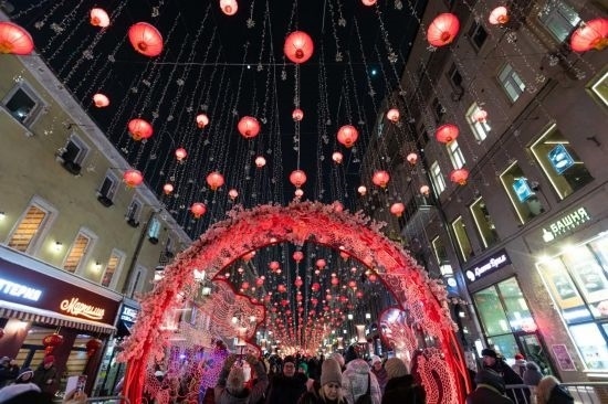 這是2月9日在俄羅斯首都莫斯科拍攝的掛滿中國(guó)新年主題裝飾的街道。當(dāng)日,“莫斯科的中國(guó)新年”文化活動(dòng)在俄羅斯首都莫斯科市中心啟動(dòng)。新華社記者 白雪騏 攝
