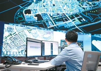 | 在天津市濱海新區(qū)中新天津生態(tài)城智慧城市運(yùn)營中心內(nèi),工作人員在查看監(jiān)控。新華社記者 趙子碩攝 |