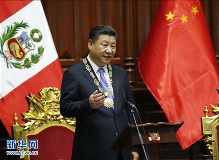 當?shù)貢r間2016年11月21日,國家主席習近平在秘魯國會發(fā)表題為《同舟共濟、揚帆遠航,共創(chuàng)中拉關系美好未來》的重要演講。新華社記者 鞠鵬 攝