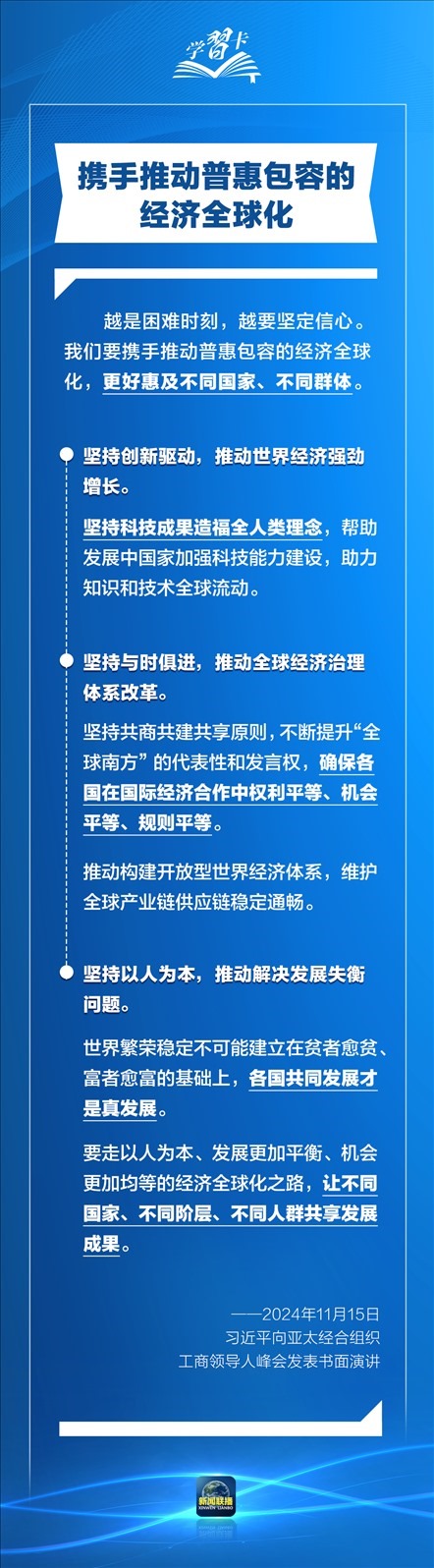 當?shù)貢r間11月15日上午,國家主席習近平向在利馬舉行的亞太經(jīng)合組織工商領導人峰會發(fā)表題為《把握時代大勢 共促世界繁榮》的書面演講。