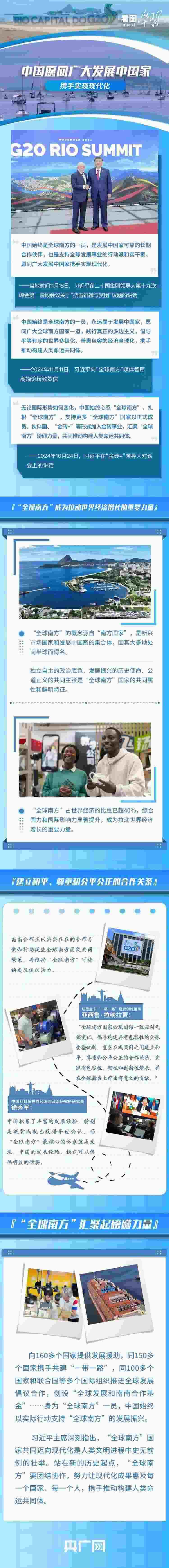 當(dāng)?shù)貢r(shí)間11月18日,習(xí)近平主席在G20峰會(huì)第一階段會(huì)議就“抗擊饑餓與貧困”議題發(fā)表重要講話(huà),呼吁作為世界主要大國(guó)領(lǐng)導(dǎo)人應(yīng)該秉持命運(yùn)共同體意識(shí),扛起歷史責(zé)任、展現(xiàn)歷史主動(dòng)、推動(dòng)歷史進(jìn)步。習(xí)主席表示,中國(guó)始終是“全球南方”的一員,是發(fā)展中國(guó)家可靠的長(zhǎng)期合作伙伴,并宣布中國(guó)支持全球發(fā)展的八項(xiàng)行動(dòng),愿同各方一道行動(dòng),建設(shè)一個(gè)共同發(fā)展的公正世界。