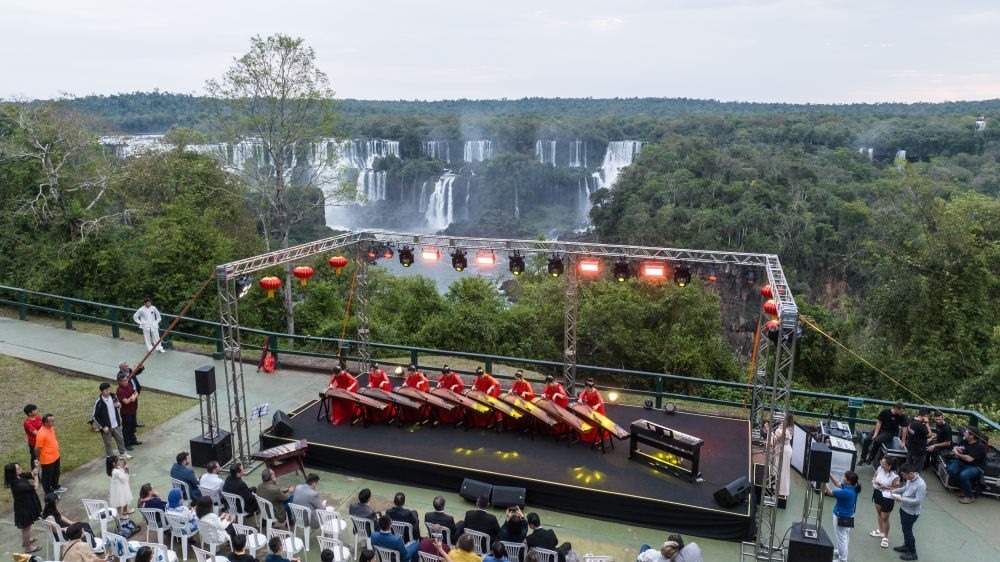 2023年9月29日,演員在巴西伊瓜蘇瀑布前舉行的中秋晚會(huì)上演奏古箏,慶祝中國(guó)傳統(tǒng)節(jié)日中秋佳節(jié)。