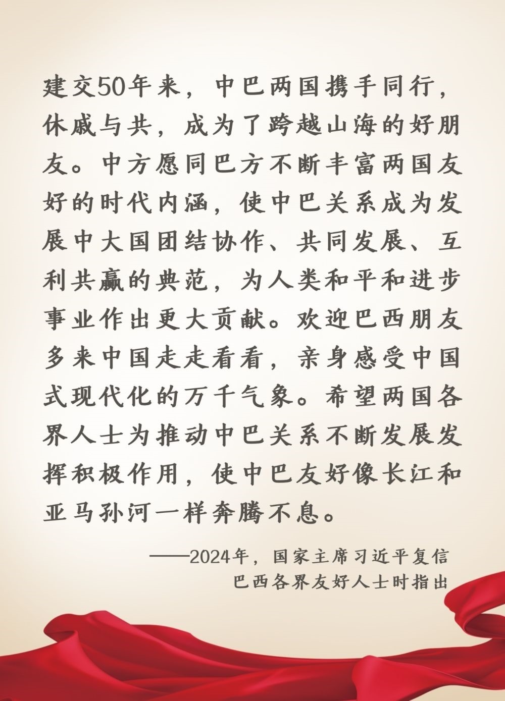 2023年4月,習(xí)近平主席同來(lái)華進(jìn)行國(guó)事訪問(wèn)的巴西總統(tǒng)盧拉舉行會(huì)談時(shí),談到雙方要以2024年慶祝建交50周年為契機(jī),繼續(xù)推動(dòng)中巴友好。