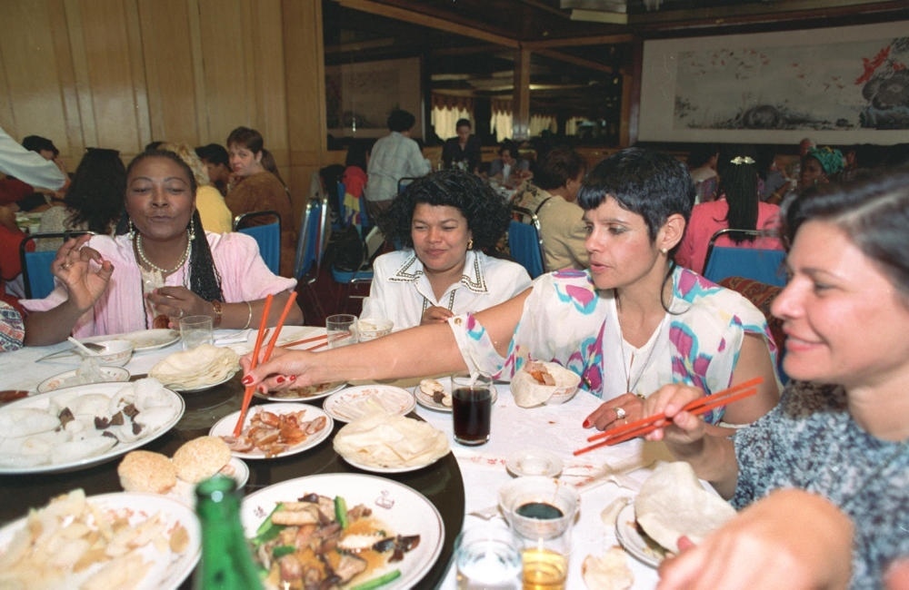 1995年9月10日,來(lái)華參加世界婦女大會(huì)的巴西代表結(jié)伴來(lái)到北京和平門(mén)全聚德烤鴨店,品嘗北京烤鴨。