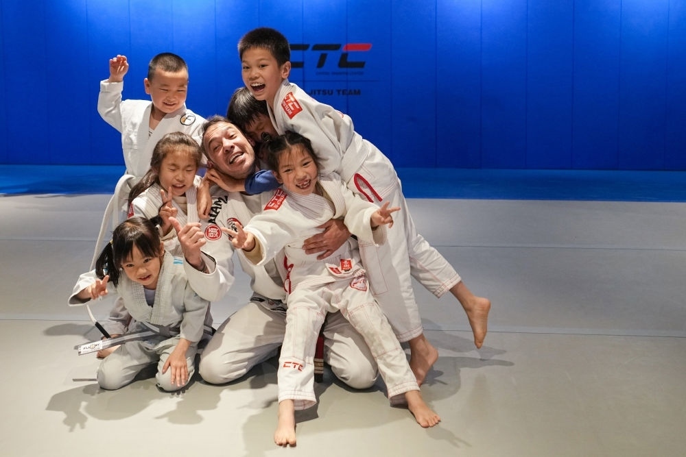 2023年4月7日,在北京一家格斗館內(nèi),巴西柔術(shù)教練席爾瓦(中)在一堂柔術(shù)課結(jié)束后與學(xué)生們合影留念。為了更好地了解中國(guó)和傳統(tǒng)武術(shù),席爾瓦于2016年來(lái)到北京,在一家格斗館擔(dān)任巴西柔術(shù)教練。