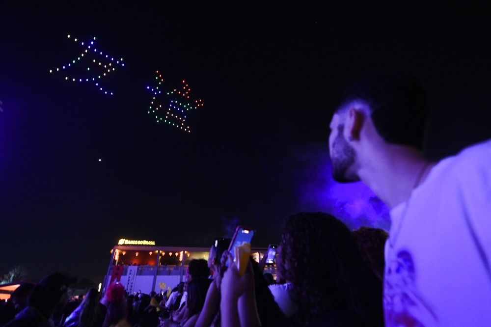 2024年8月17日,在巴西首都巴西利亞,人們?cè)谏碁┧囆g(shù)節(jié)中國(guó)日活動(dòng)上觀看無(wú)人機(jī)表演。