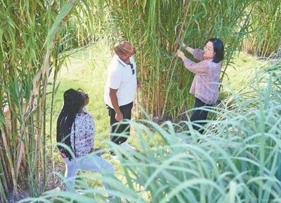 心聯(lián)通福建農(nóng)林大學(xué)國際菌草工程技術(shù)研究中心工作人員(右)在向盧旺達(dá)留學(xué)生介紹菌草品種“綠洲1號”蘆竹的生長情況。新華社記者 林善傳攝