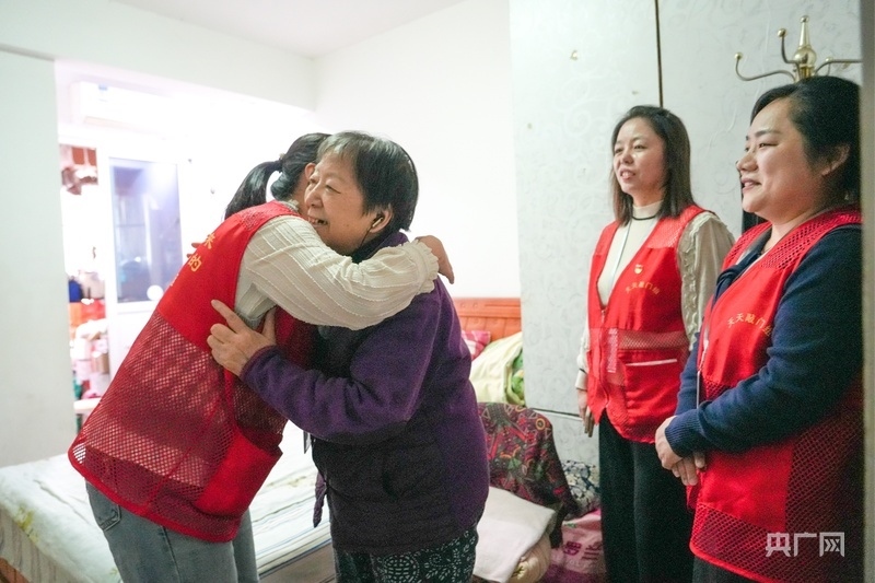 張麗娟熱情地?fù)肀鐓^(qū)工作人員(央廣網(wǎng)見(jiàn)習(xí)記者鄧子依 攝)
