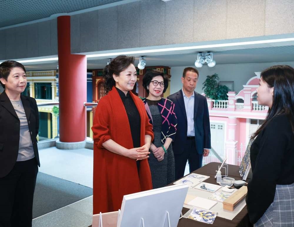 12月19日上午,國家主席習近平夫人彭麗媛在澳門特別行政區(qū)行政長官賀一誠夫人鄭素貞陪同下,來到澳門博物館參觀。彭麗媛仔細察看館藏文物,深入了解澳門的歷史變遷和中西交融的建筑、行業(yè)、文化生活等情況,同當?shù)卮纱u畫制作、木雕等非遺傳承人親切交流。