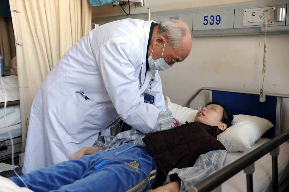 瑞金醫(yī)院終身教授王振義在上海瑞金醫(yī)院為病人看病(資料照片)。新華社發(fā)