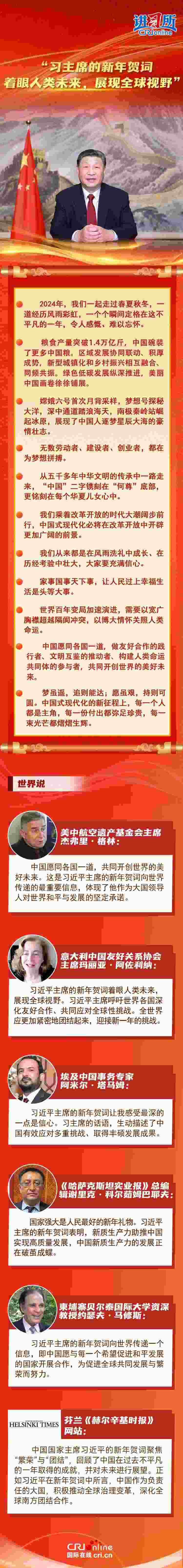 多國(guó)人士認(rèn)為,習(xí)近平主席的新年賀詞著眼人類未來,展現(xiàn)全球視野,體現(xiàn)了作為大國(guó)領(lǐng)導(dǎo)人對(duì)世界和平與發(fā)展的堅(jiān)定承諾。
