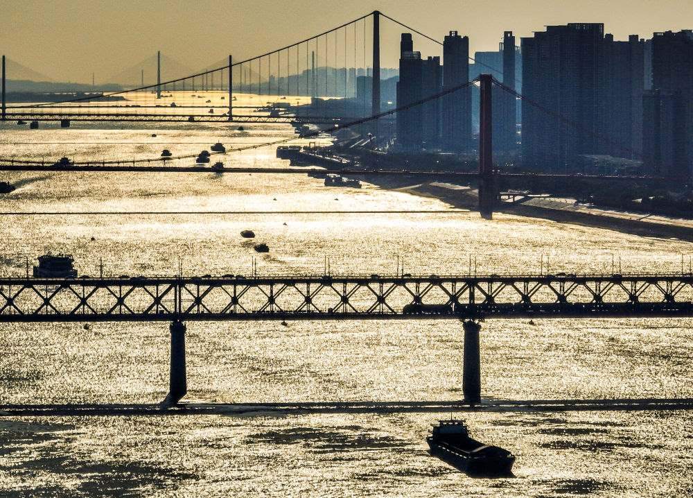 2024年1月23日,一列火車從武漢長江大橋上駛過(無人機(jī)照片)。