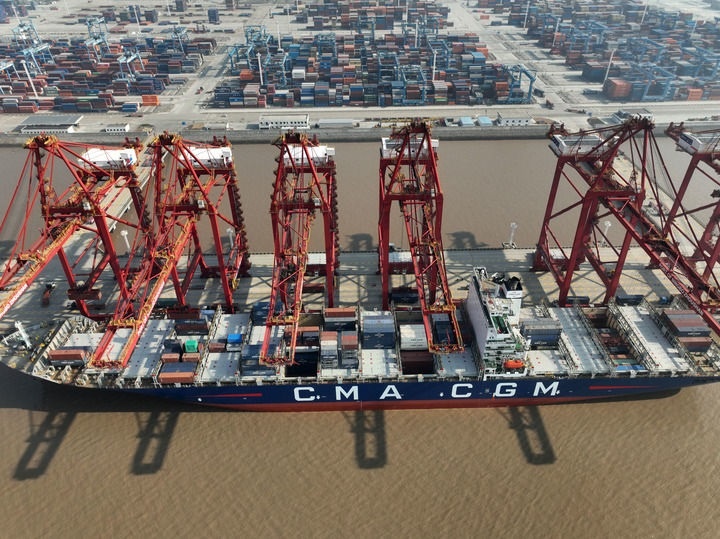 貨輪在浙江寧波舟山港金塘港區(qū)大浦口集裝箱碼頭泊位上裝卸集裝箱(2025年1月4日攝,無人機(jī)照片)。新華社發(fā)(鄒訓(xùn)永 攝)