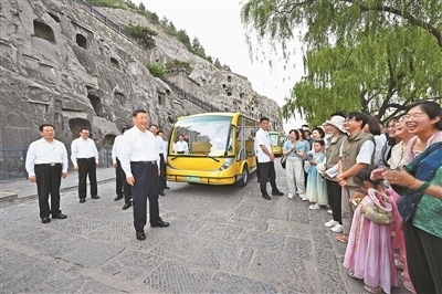 已有1500多年歷史的龍門石窟,是重要的世界文化遺產(chǎn)。習(xí)近平來到這里,察看石窟整體布局風(fēng)貌和代表性窟龕、造像,同現(xiàn)場的文物保護(hù)工作者親切交流。他強(qiáng)調(diào),要把這些中華文化瑰寶保護(hù)好、傳承好、傳播好。游客們見到總書記,都十分欣喜,紛紛向總書記問好。習(xí)近平不時(shí)同大家交流,特別鼓勵(lì)小朋友們多到實(shí)地尋溯中華文化,從小樹立文化自信。他指出,文旅融合前景廣闊,要推動(dòng)文旅產(chǎn)業(yè)高質(zhì)量發(fā)展,真正打造成為支柱產(chǎn)業(yè)、民生產(chǎn)業(yè)、幸福產(chǎn)業(yè)。