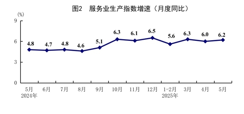 5月份,全國服務(wù)業(yè)生產(chǎn)指數(shù)同比增長(zhǎng)6.2%,比上月加快0.2個(gè)百分點(diǎn)。分行業(yè)看,信息傳輸、軟件和信息技術(shù)服務(wù)業(yè),租賃和商務(wù)服務(wù)業(yè),批發(fā)和零售業(yè)生產(chǎn)指數(shù)同比分別增長(zhǎng)11.2%、8.9%、8.4%,分別快于服務(wù)業(yè)生產(chǎn)指數(shù)5.0、2.7、2.2個(gè)百分點(diǎn)。1—5月份,全國服務(wù)業(yè)生產(chǎn)指數(shù)同比增長(zhǎng)5.9%。1—4月份,規(guī)模以上服務(wù)業(yè)企業(yè)營業(yè)收入同比增長(zhǎng)7.2%。5月份,服務(wù)業(yè)商務(wù)活動(dòng)指數(shù)為50.2%,比上月上升0.1個(gè)百分點(diǎn);服務(wù)業(yè)業(yè)務(wù)活動(dòng)預(yù)期指數(shù)為56.5%,上升0.1個(gè)百分點(diǎn)。其中,鐵路運(yùn)輸、航空運(yùn)輸、郵政、電信廣播電視及衛(wèi)星傳輸服務(wù)、互聯(lián)網(wǎng)軟件及信息技術(shù)服務(wù)等行業(yè)商務(wù)活動(dòng)指數(shù)位于55.0%以上較高景氣區(qū)間。