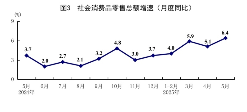 5月份,社會(huì)消費(fèi)品零售總額41326億元,同比增長(zhǎng)6.4%,比上月加快1.3個(gè)百分點(diǎn);環(huán)比增長(zhǎng)0.93%。按經(jīng)營單位所在地分,城鎮(zhèn)消費(fèi)品零售額36057億元,同比增長(zhǎng)6.5%;鄉(xiāng)村消費(fèi)品零售額5269億元,增長(zhǎng)5.4%。按消費(fèi)類型分,商品零售額36748億元,增長(zhǎng)6.5%;餐飲收入4578億元,增長(zhǎng)5.9%?;旧铑惡筒糠稚?jí)類商品銷售增勢(shì)較好,限額以上單位糧油食品類、金銀珠寶類、體育娛樂用品類商品零售額分別增長(zhǎng)14.6%、21.8%、28.3%。消費(fèi)品以舊換新政策持續(xù)顯效,限額以上單位家用電器和音像器材類、通訊器材類、文化辦公用品類、家具類商品零售額分別增長(zhǎng)53.0%、33.0%、30.5%、25.6%。1—5月份,社會(huì)消費(fèi)品零售總額203171億元,同比增長(zhǎng)5.0%。全國網(wǎng)上零售額60402億元,同比增長(zhǎng)8.5%。其中,實(shí)物商品網(wǎng)上零售額49878億元,增長(zhǎng)6.3%,占社會(huì)消費(fèi)品零售總額的比重為24.5%。1—5月份,服務(wù)零售額同比增長(zhǎng)5.2%。