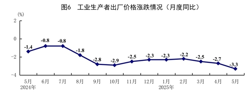 5月份,全國工業(yè)生產(chǎn)者出廠價(jià)格同比下降3.3%,環(huán)比下降0.4%;全國工業(yè)生產(chǎn)者購進(jìn)價(jià)格同比下降3.6%,環(huán)比下降0.6%。1—5月份,全國工業(yè)生產(chǎn)者出廠價(jià)格和購進(jìn)價(jià)格均比上年同期下降2.6%。