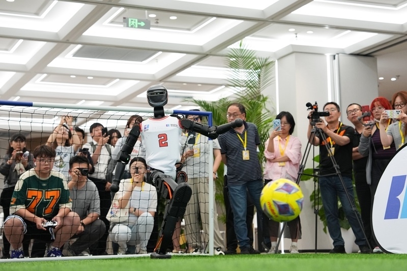 6月17日,加速進(jìn)化Booster T1機(jī)器人在北京經(jīng)開(kāi)區(qū)的機(jī)器人大世界展示“大力射門(mén)”。