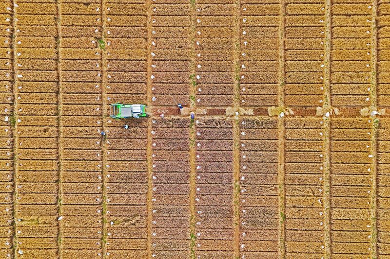 6月18日,收割機(jī)在山東省煙臺(tái)市一處試驗(yàn)田里收割小麥(無(wú)人機(jī)照片)。