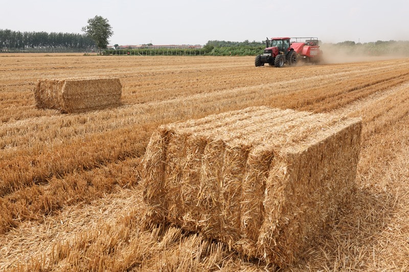 6月18日,在河北石家莊晉州市周家莊鄉(xiāng)北捏盤(pán)村麥田,農(nóng)戶駕駛秸稈打捆機(jī)作業(yè)。