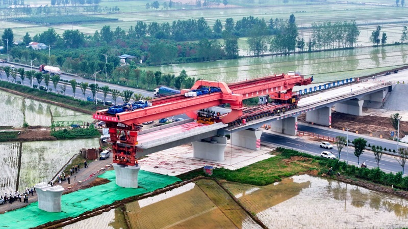 6月21日,在濰宿高鐵郯城沭河特大橋施工現(xiàn)場,中鐵上海局工作人員在進行箱梁架設(shè)(無人機照片)。
