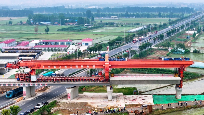 6月21日,在濰宿高鐵中鐵上海局郯城制梁場,提梁機在提運箱梁(無人機照片)。