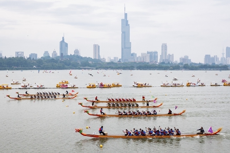 5月31日,龍舟隊(duì)在南京玄武湖上競(jìng)逐(無(wú)人機(jī)照片)。