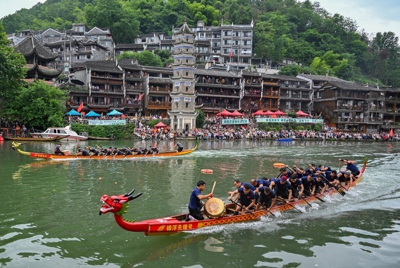 5月31日,在湖南省湘西土家族苗族自治州鳳凰古城,龍舟隊(duì)展開(kāi)激烈角逐。