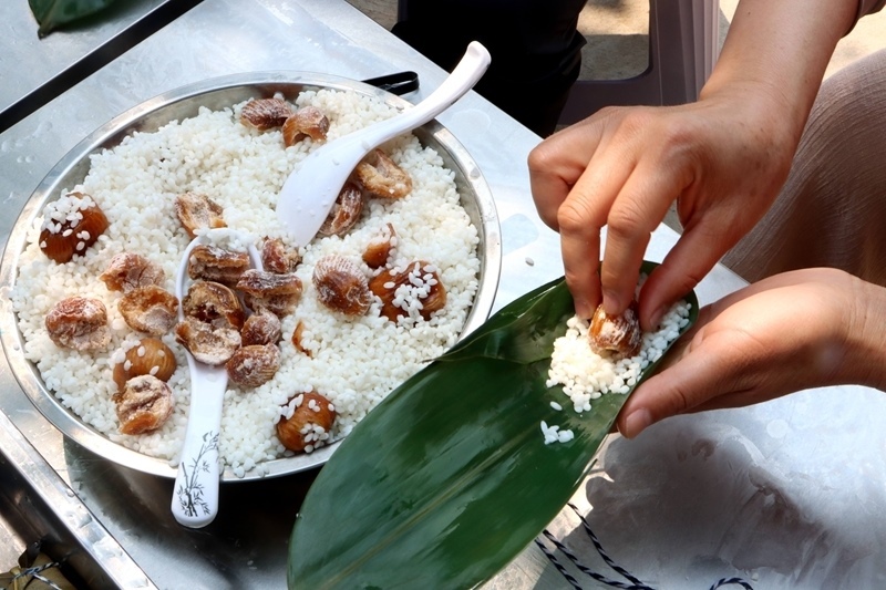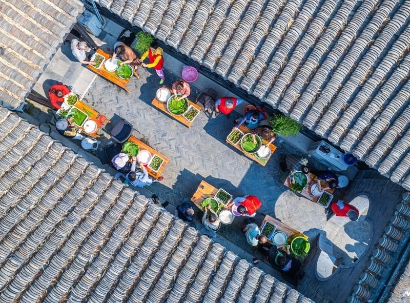 5月29日,在江蘇省興化市新時(shí)代文明實(shí)踐中心,居民參加包粽子比賽(無(wú)人機(jī)照片)。