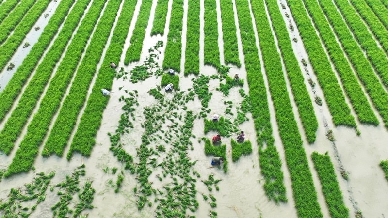 6月8日,在江蘇省宿遷市泗洪縣石集鄉(xiāng)汴水社區(qū),農(nóng)民在秧田中起秧苗(無(wú)人機(jī)照片)。