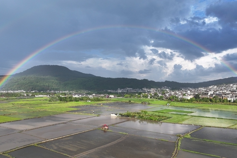 6月8日,在云南省騰沖市和順古鎮(zhèn),農(nóng)民駕駛機(jī)械翻耕農(nóng)田,準(zhǔn)備栽插水稻秧苗(無(wú)人機(jī)照片)。
