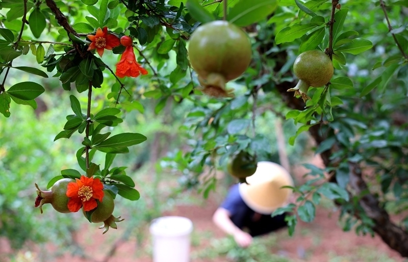 6月18日,在山東棗莊嶧城石榴園,果農(nóng)在石榴樹(shù)下勞作。