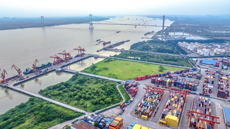 6月29日,在江蘇泰州港集裝箱碼頭,貨船停在泊位裝卸集裝箱(無人機照片)。