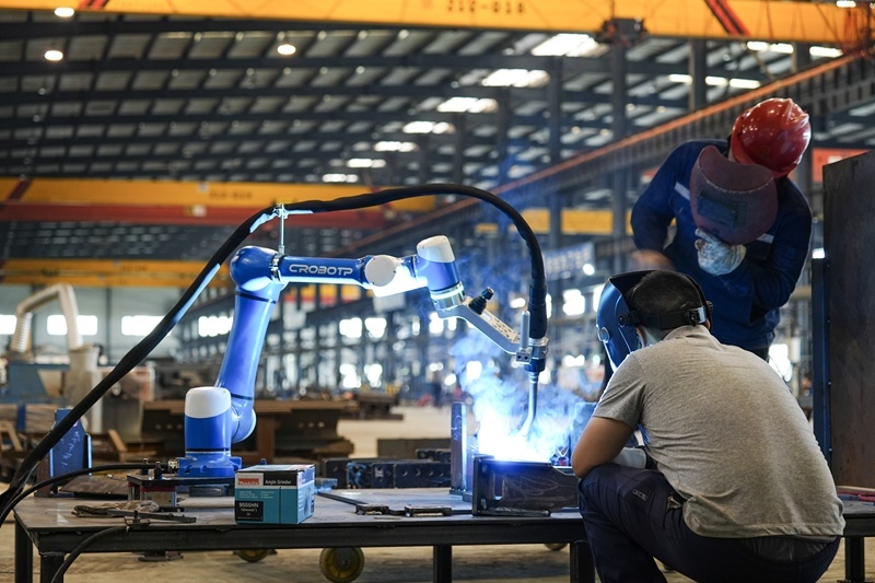 6月26日,在四川天府新區(qū)眉山片區(qū)青龍街道的新筑智能工程裝備制造有限公司車間內(nèi),工人們配合機器人焊接產(chǎn)品。
