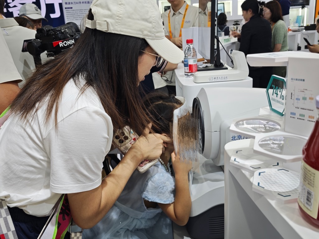 在2025年服貿(mào)會(huì)健康衛(wèi)生服務(wù)專(zhuān)題展,一位工作人員帶著小朋友體驗(yàn)智能屈光篩查儀。新華社記者 劉禎 攝