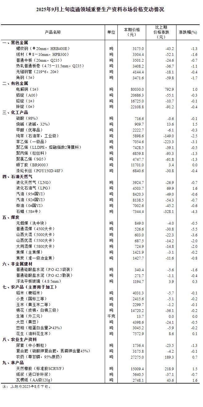 據(jù)國(guó)家統(tǒng)計(jì)局網(wǎng)站消息,國(guó)家統(tǒng)計(jì)局14日公布2025年9月上旬流通領(lǐng)域重要生產(chǎn)資料市場(chǎng)價(jià)格變動(dòng)情況。