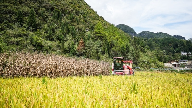 工作人員駕駛農(nóng)用機(jī)械在長順縣長寨街道中塘村收割水稻(9月17日攝)。